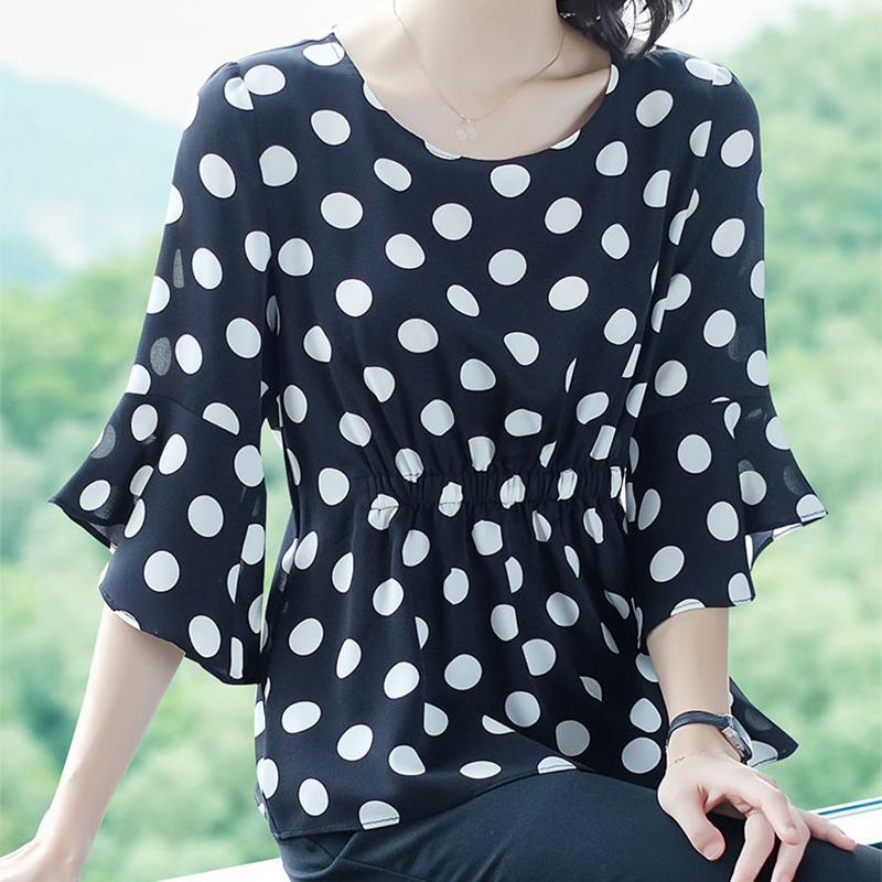 Spring and Autumn Ladies Chiffon Shirt Polka Dot Cover Belly Summer Ruffled Waist Blouse Western Style Small Shirt