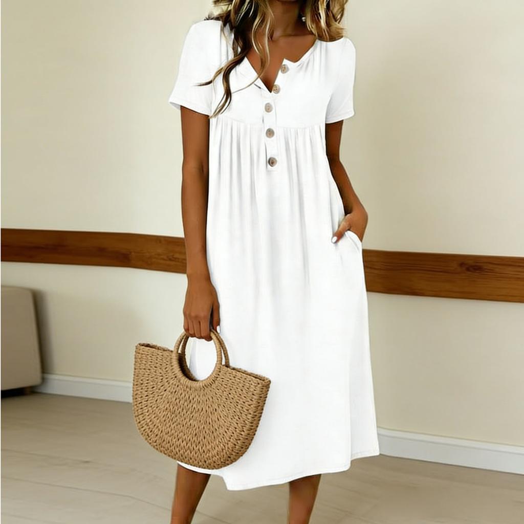 Women's Color Dress With Button Collar Short Sleeves Midi Length