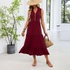 Women's Fashionable Color V,neck Button Sleeveless Long Pleated Loose Dress