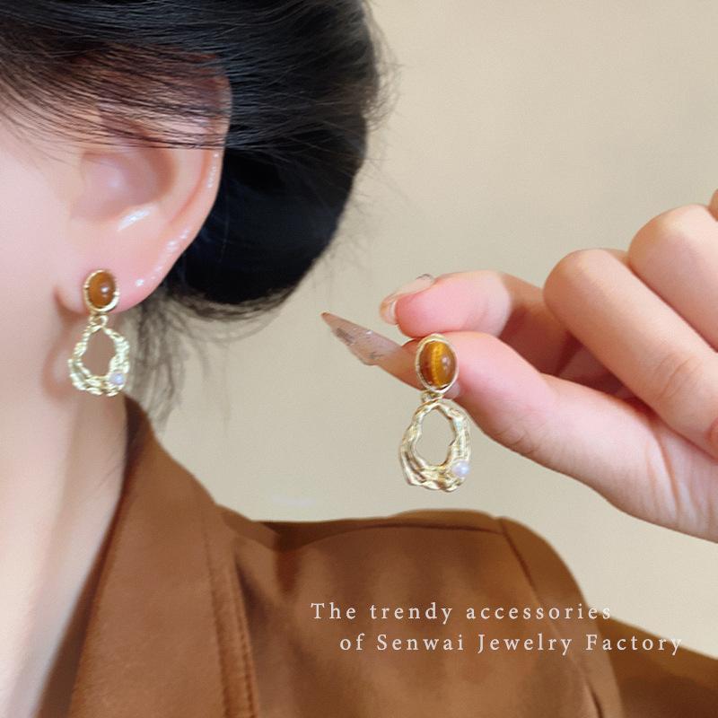 Retro Imitation Tiger's Eye Stone Pearl Stud Earrings Women's Light Luxury Design Earrings Maillard Ear Jewelry