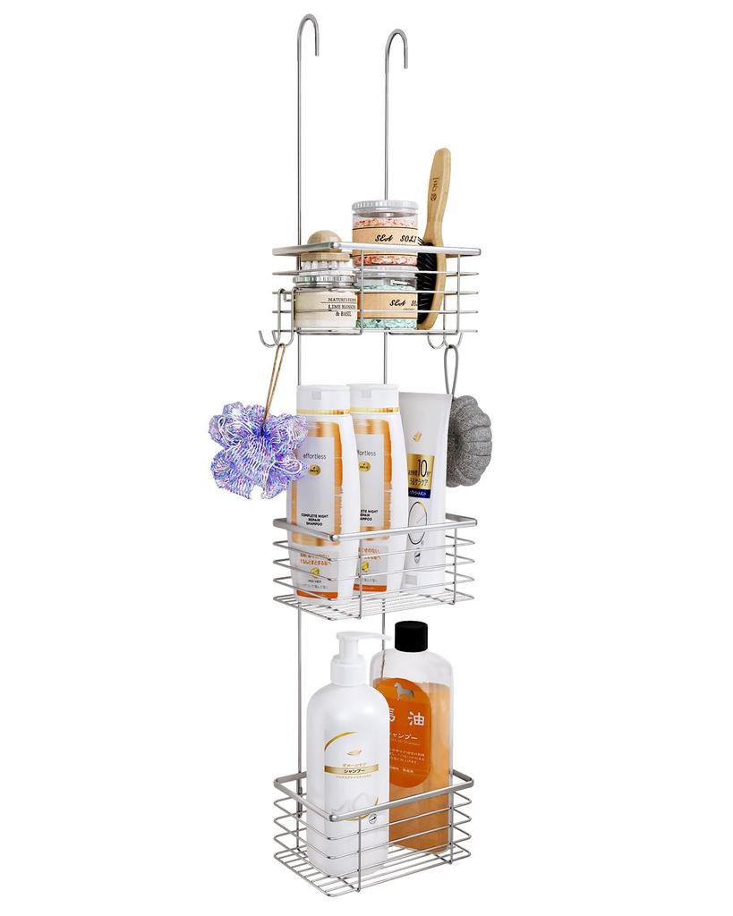QIHS 3-Tier Shower Rack, Stainless Steel, Wall-Mounted, 89.5cm X 19cm, with Hooks, Bathroom Storage Shelf