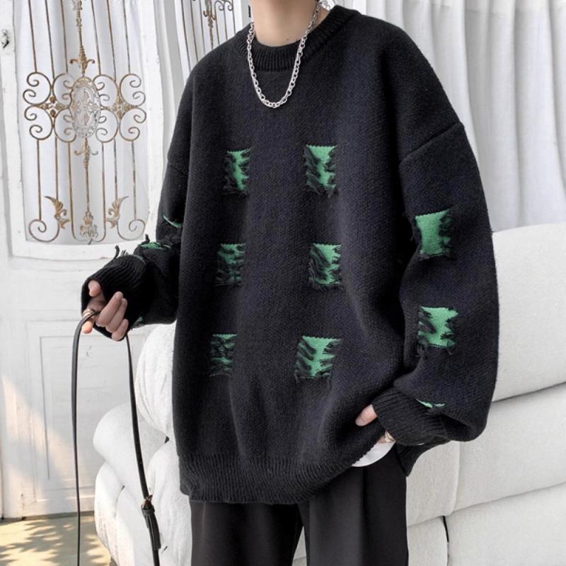 Autumn Winter New Style Distressed Sweater For Men American Streetwear Trendy Casual Loose Design Versatile Crew Neck Knitwear
