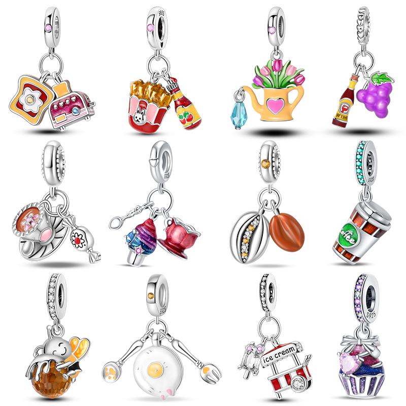 925 Silver Coffee Cake Bread Ice Cream Tea Beer Charms Pendant for 3mm Bracelets DIY Jewelry