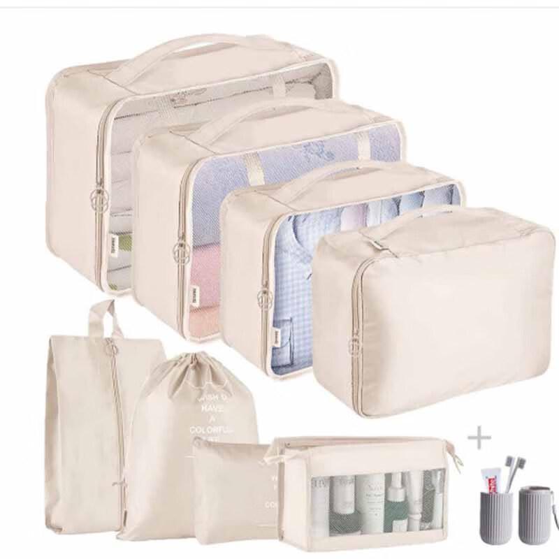 ModelBeige 9-Piece Travel Storage Bag Set (No Wash Cup)