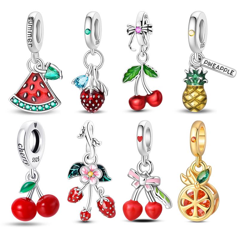 100%Stering Copper Fruit Series Charms Beads Strawberry Cherry Orange Pendant Fit Original Bracelet Diy For Women Jewelry