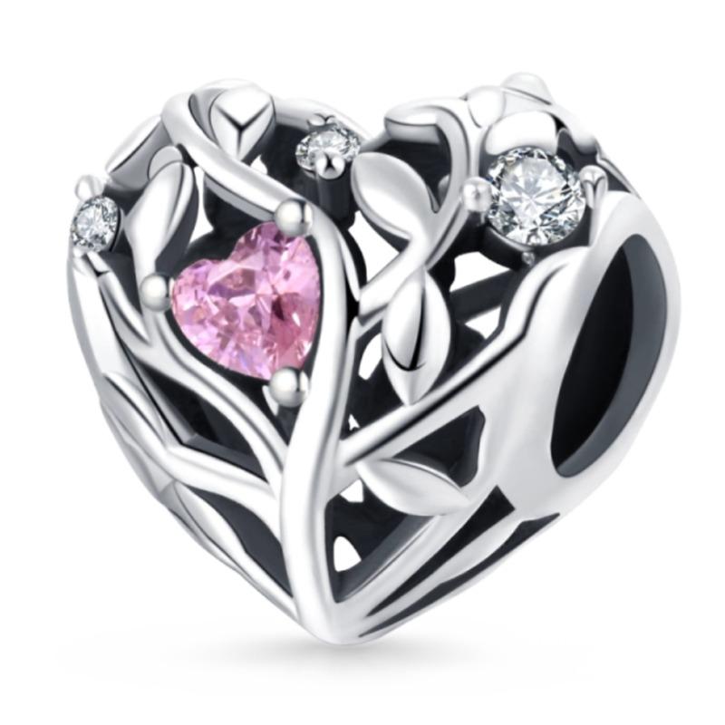 100%Stering Copper Heart Tree Of Love Charms Beads Pink Gems Heart Charms Fit 3Mm Original Bracelet Diy For Women Jewelry