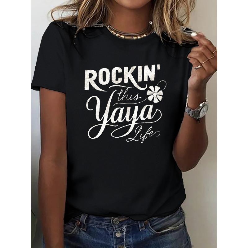Womens Vintage Yaya Slogan Floral Print Tee Rockin This Yaya Life Short Sleeve Boho Style Casual Black White Graphic Machine Washable Top