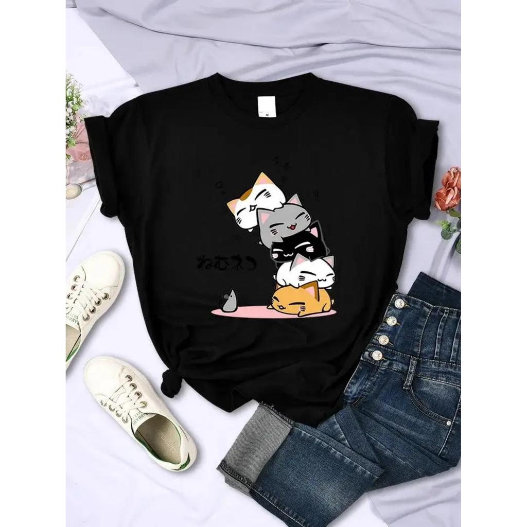 Cute Stacked Cats Sleeping Don'T See The Mouse Print Street Women T-Shirt Plus Size Casuals Tops Creativity Fashion 1232