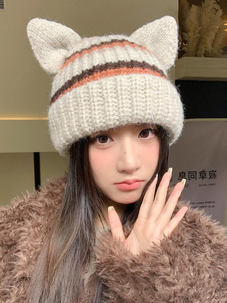 Winter Women Cute Cat Ears Stretchy Hats Fashion Warm Beanie Hat Striped Knitted Handmade Adult Cover Head Caps Casual New