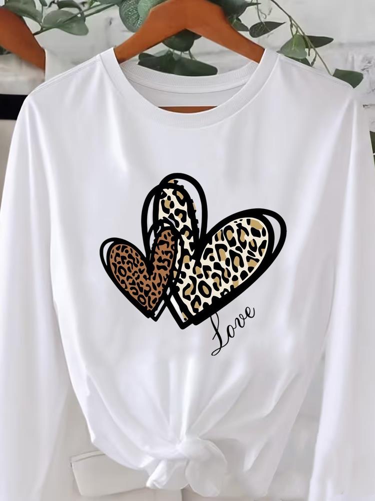 (Asian Size) Long Sleeve T Shirt Tee O-neck Leopard Love Heart Print Autumn Winter Spring Women Clothing Casual Fashion Top Graphic T-shirts