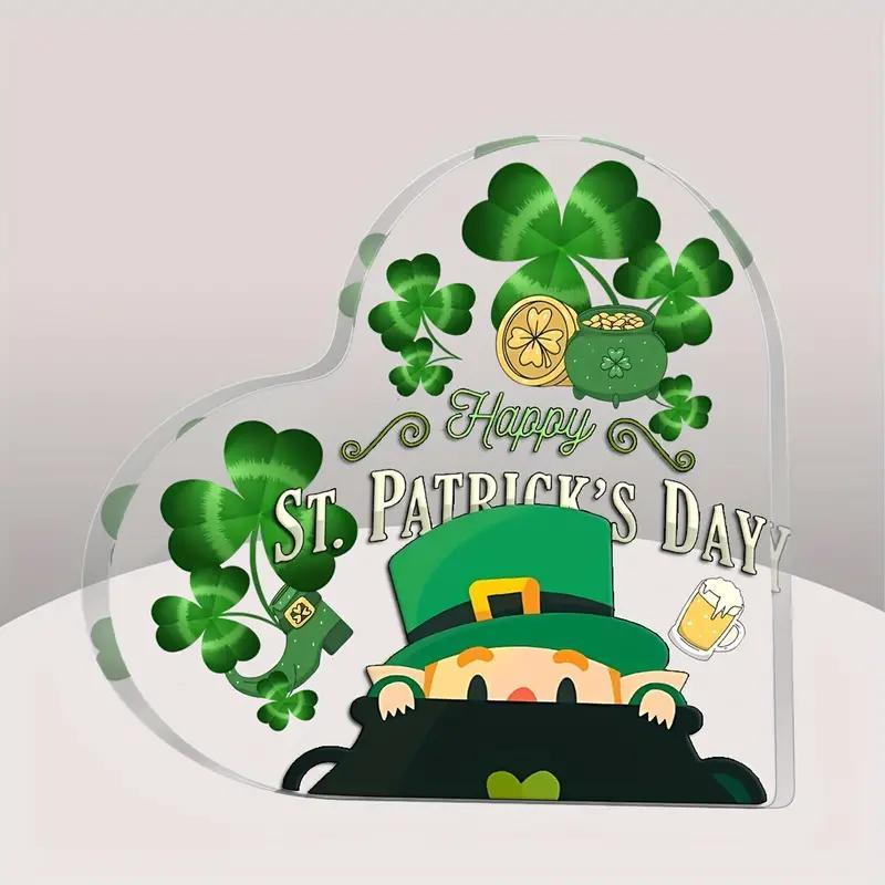 2D Flat, St. Patrick's Day Heart Shaped Acrylic Desktop Decoration, Leprechams&Shamrocks Pattern Design, Suitable for Wall Decoration, Porch, Room, Vi
