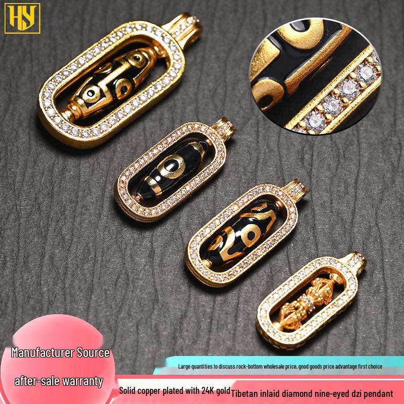 24k Gold-Plated Tibetan Nine-Eyed Dzi Bead Pendant Necklace with Zircon Inlay
