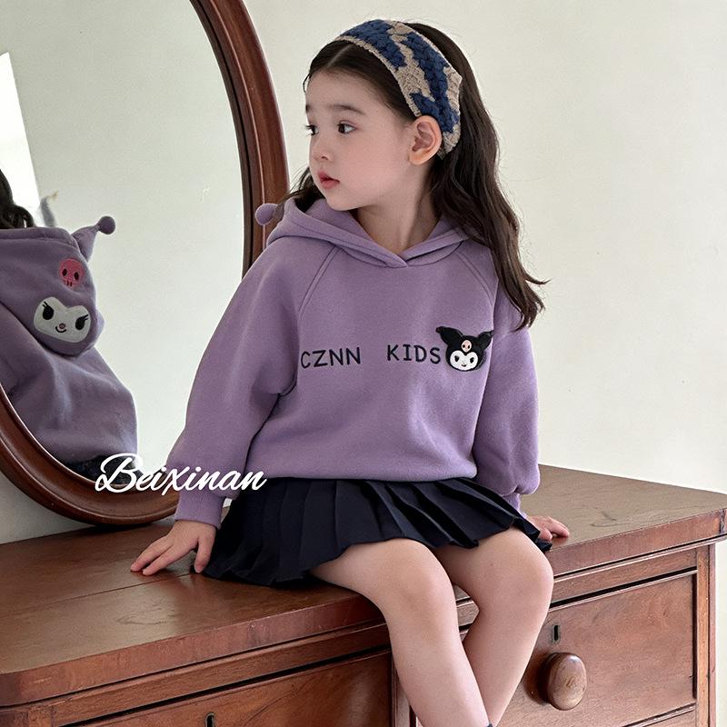 Korean-Style Velvet Hoodie & Pleated Skirt Set for Girls - Autumn/Winter Cartoon Design