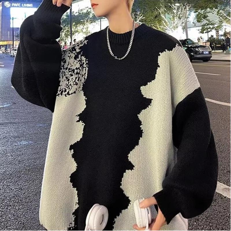 Men's Oversized Crew Neck Knit Sweater Black White Irregular Pattern Loose Fit Casual Streetwear Pullover