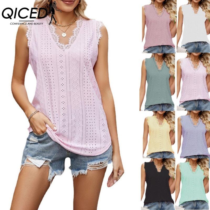 QICED Women's Fashion Casual Solid Color Print Sleeveless V Neck Blouses & Shirts