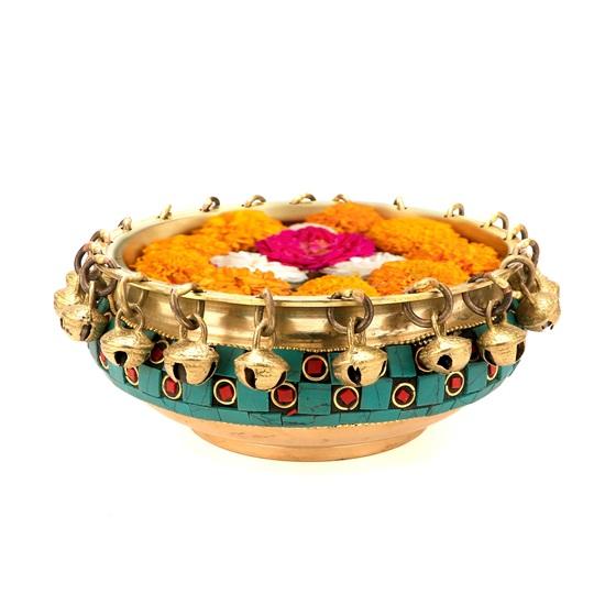 Two Moustaches 100% Pure Brass Ethnic Traditional Bowl with Bells, Gemstone Work, Material Brass, Pack of 1