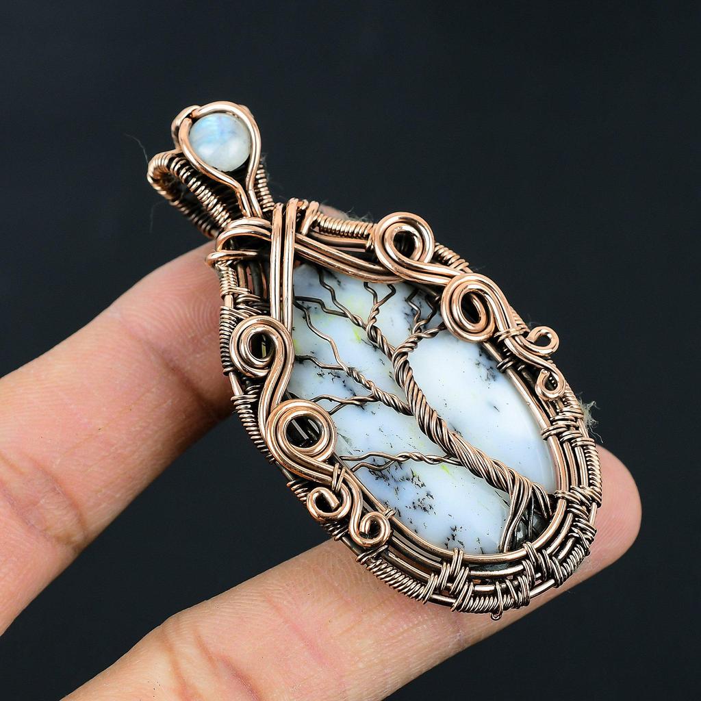 Handmade Tree of Life Copper Wire Wrapped Pendant Dendritic Opal & Moonstone Gemstone Pendant Jewelry for Women