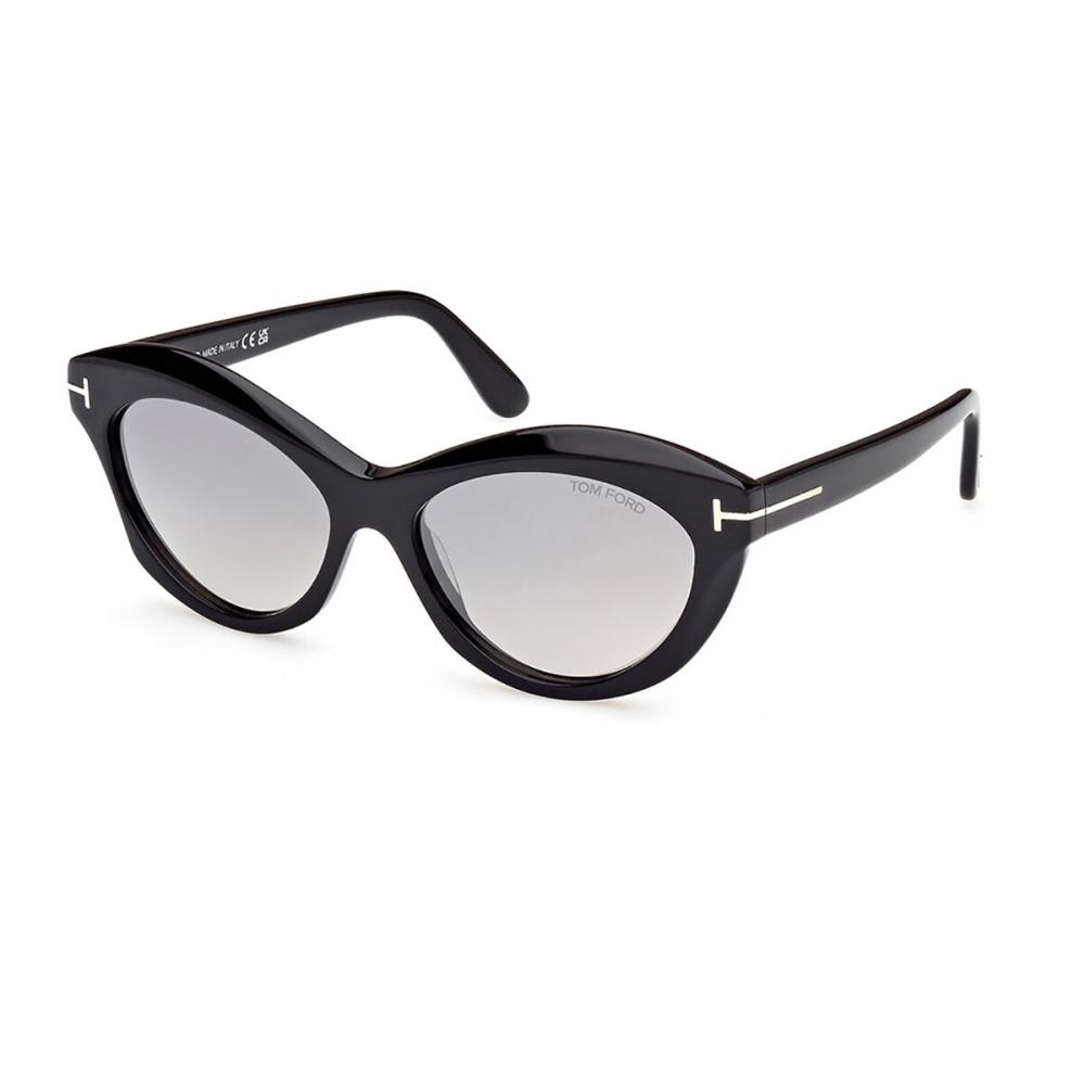The Tom Ford FT1111 Toni 01C Women's Sunglasses feature a shiny black full-rim acetate frame with smoke mirror lenses, showcasing a soft oval design in a cat-eye shape that emphasizes bold and elegant lines. The frame's temples are adorned with a metal T logo and T metal temple decoration, adding a touch of sophistication. These sunglasses are made from durable and lightweight plastic acetate, with a gradient effect that transitions from a darker top to a lighter bottom.