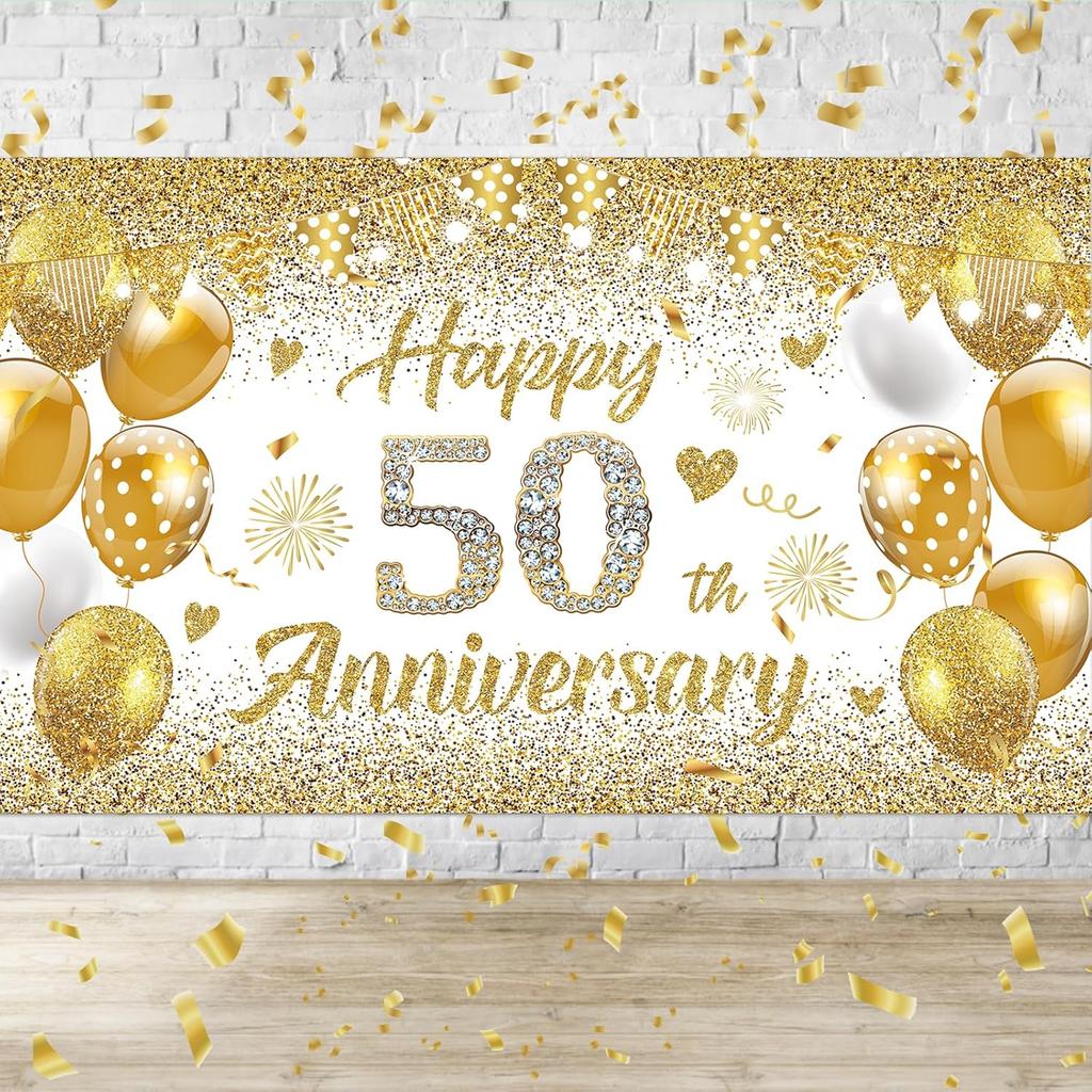 50th Wedding Anniversary Banner Decorations, White Gold Happy 50 Anniversary Party Supplies, Golden 50 Th Wedding Anniversary Decorations Decor
