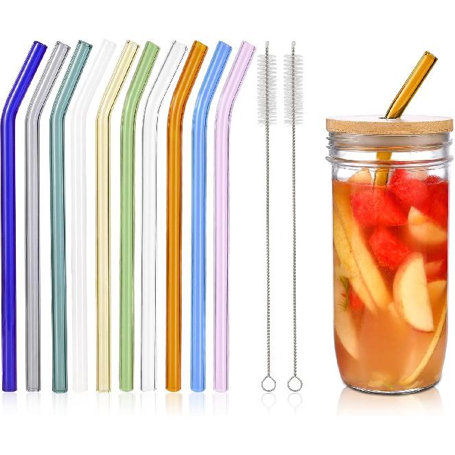 10 Pcs Reble Bent Glass Drinking Straws,9''x10 Mm Colorful Glass Straws for Beverages, Shakes, Milk Tea, Juices,Set of 10 Bent with 2 Cleaning
