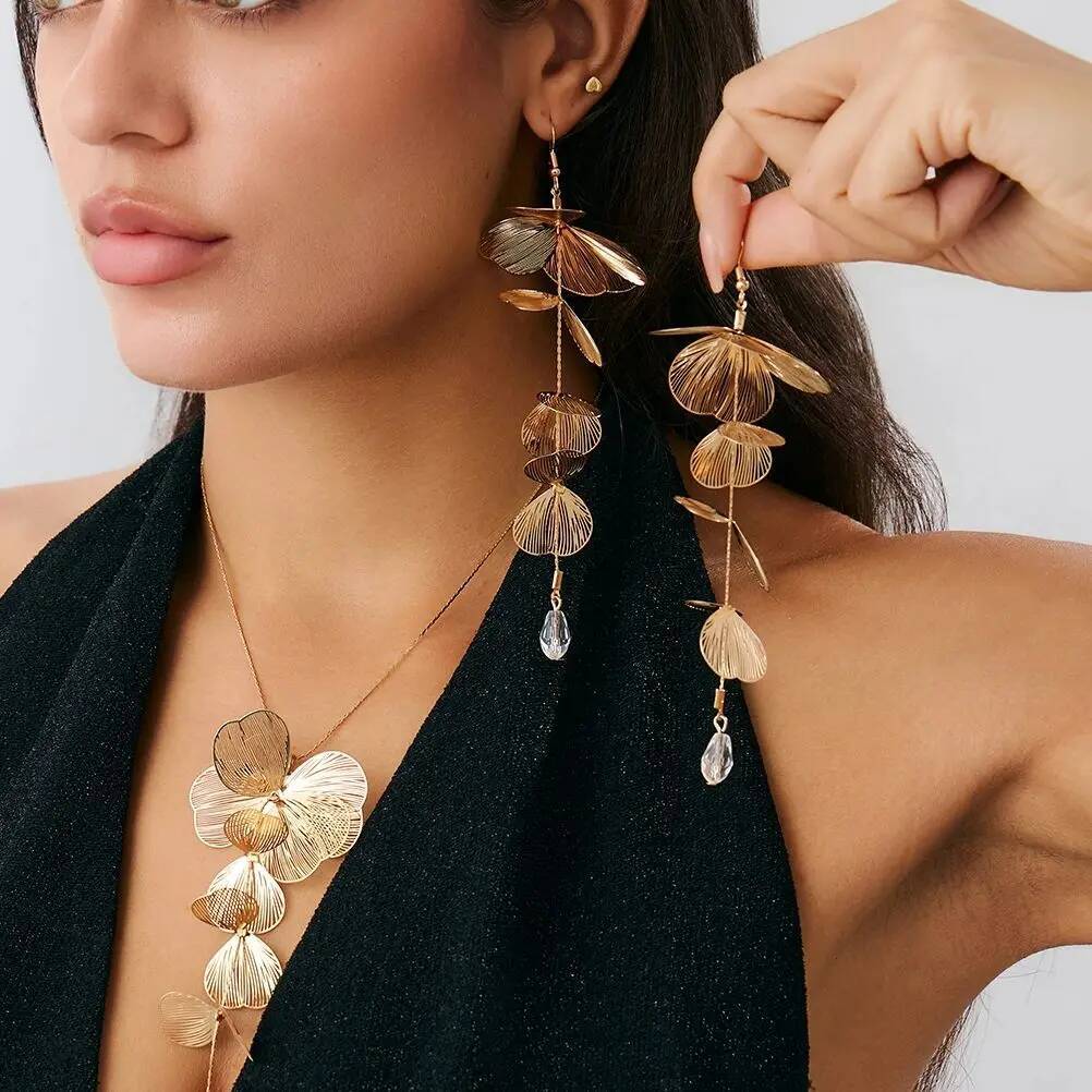 Salircon Fashion Elegant Long Metal Petal Flower Tassel Pendant Necklace Earrings Women Exquisite Earrings Banquet Jewelry Set