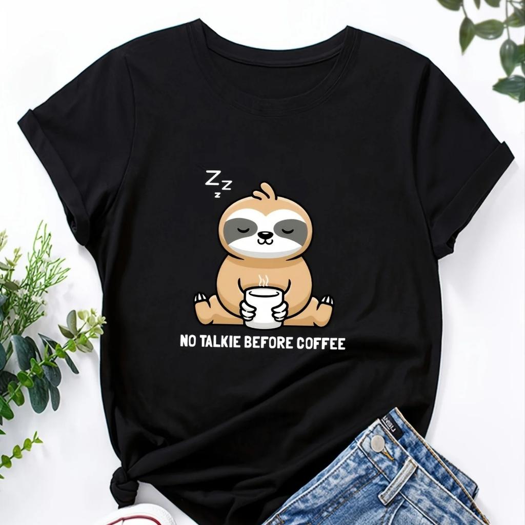 Cartoon Sloth Print Solid T-Shirt Short Sleeve Crew Neck Casual Top For All Season Women's Clothing Street Summer Short Sleeves