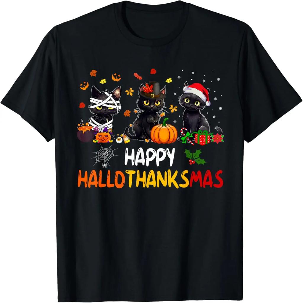 Funny Cat Happy Hallothanksmas Halloween Thanksgiving Xmas T-Shirt