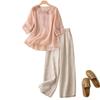 Stylish Two-piece Cotton-linen Set: Top, Vintage-inspired, Casual, And Wide-leg Pants.