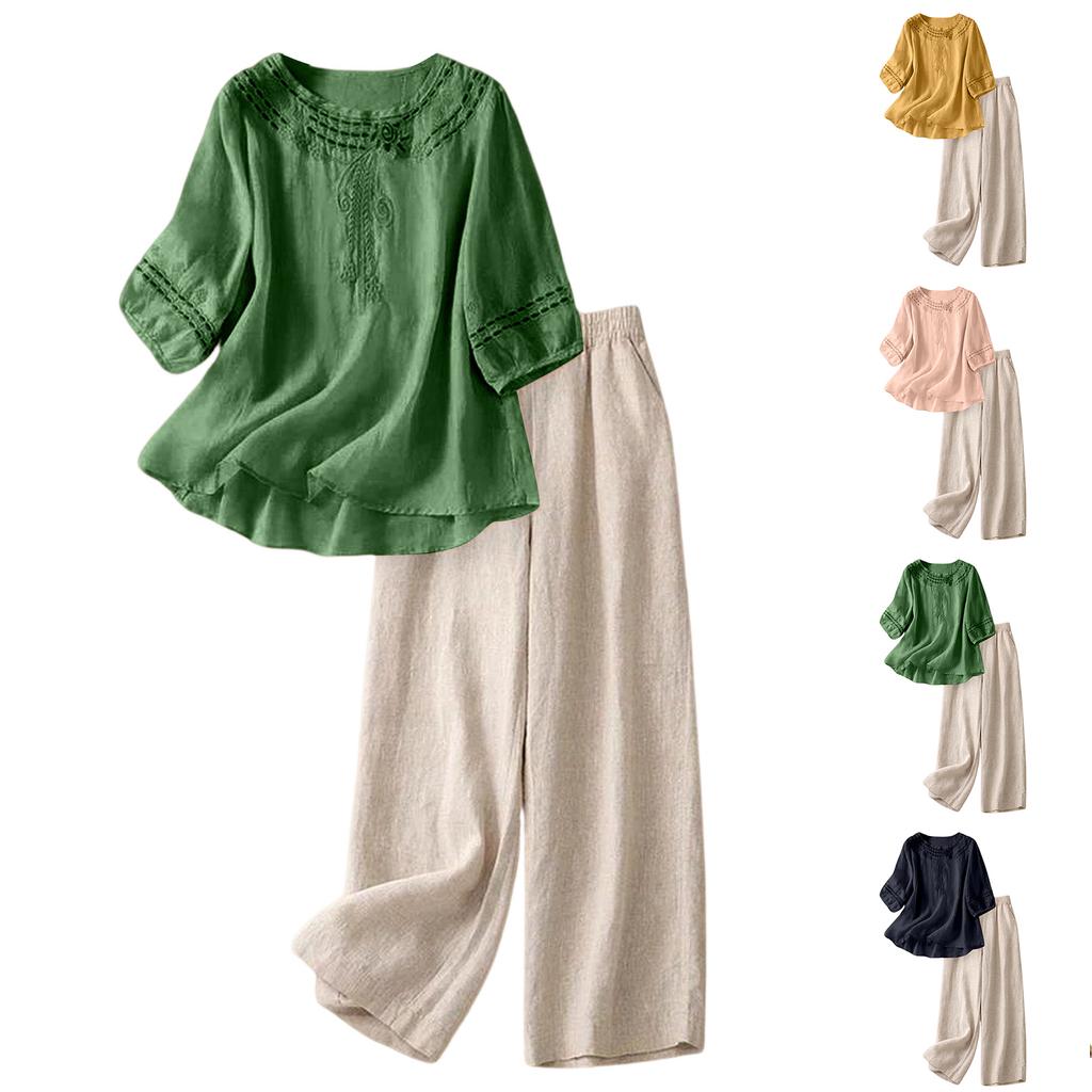 Stylish two-piece cotton-linen set: top, vintage-inspired, casual, and wide-leg pants.