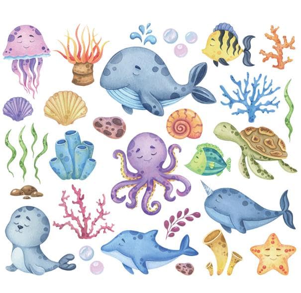 This vibrant and colorful design features a variety of sea creatures, including dolphins, whales, sharks, octopuses, starfish, and more. Perfect for a child's bedroom, playroom, or bathroom.