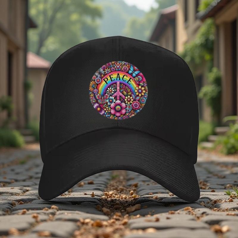 Peace Sign Hippie Rainbow Floral Print Baseball Cap Unisex Cotton Adjustable Casual Summer Hat