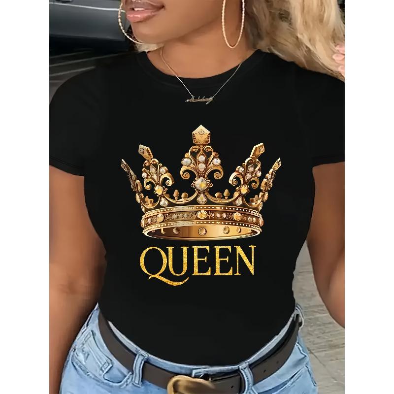 Womens Queen Crown Print Round Neck Short Sleeve T Shirt Medium Stretch Fabric Machine Washable Casual Semi Formal All Season Top