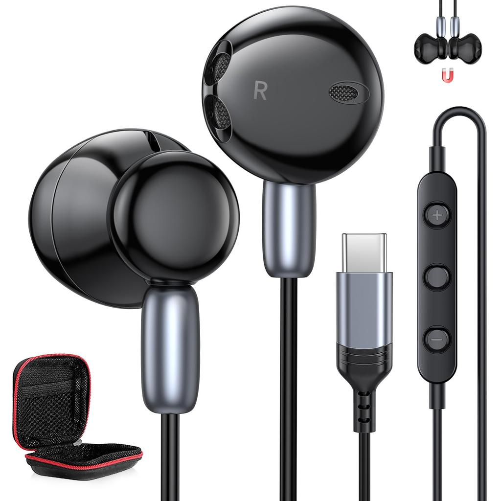 Wired Type-C earphones with microphone, USB Type-C compatible, iPhone 16, noise-canceling earphones for PC/PC, high-quality sound, deep bass, calls, magnetic storage, USB-C wired earphones, telework and gaming earphones, compatible with iPhone 15, iPad Pro, MacBook, Android smartphones, Samsung Galaxy, Google Pixel, Xperia, Oppo, and Huawei, telework, online meetings, gaming, YouTube, ZOOM, Skype, and web conferencing. Lightweight, comfortable earbuds for listening while doing other things, no delay, no sound leakage, remote control included, comfortable fit, for commuting, work, business, running, and calls. Type-C wired earphones with in-line controls and storage case. Compatible with: iPhone 16, 15, 15 Pro, 15 Pro Max, 15 Plus, iPad Pro, iPad Air 4, 5 mini, 6, and 10th generation.