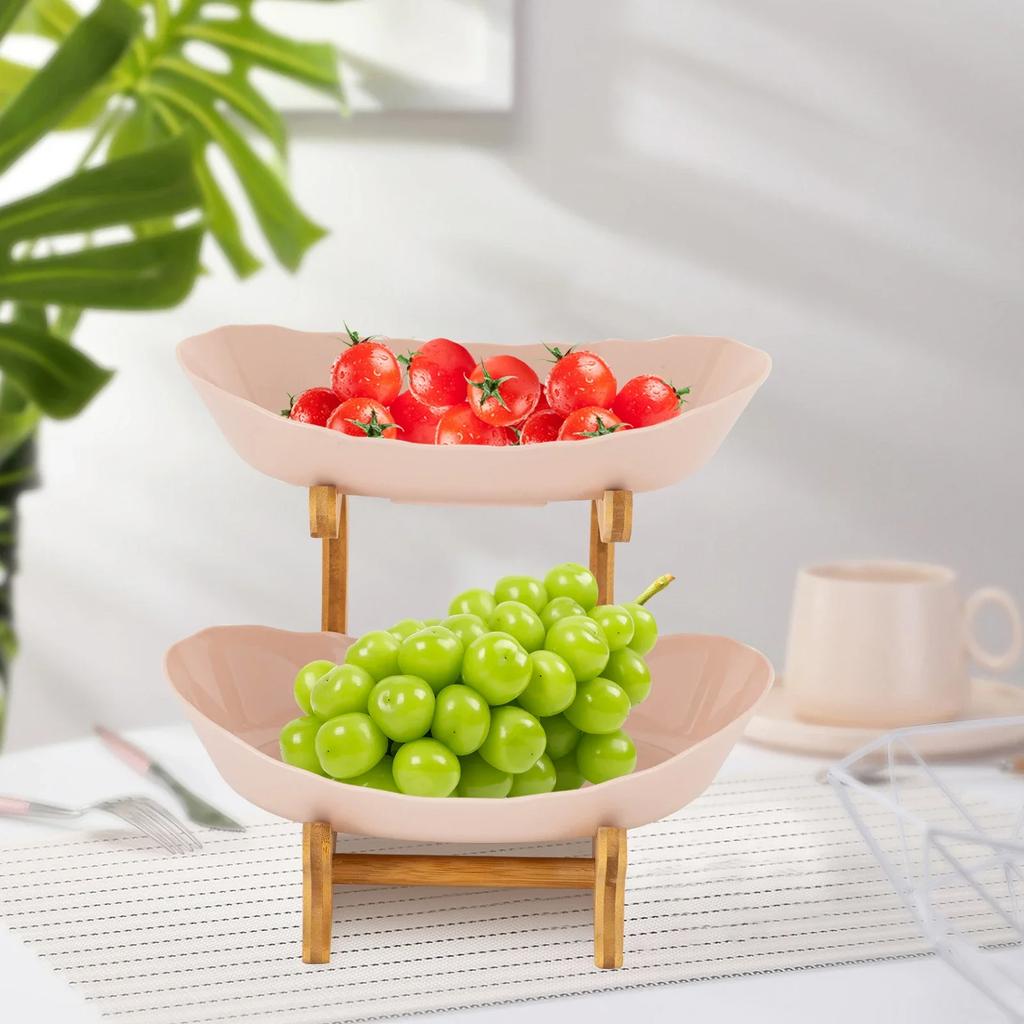 Fruit Bowl Fruit Basket 2 Tier Large Plastic Ceramic Bowl with Bamboo Stand for Snacks Candy Dessert Table Centerpiece Decor