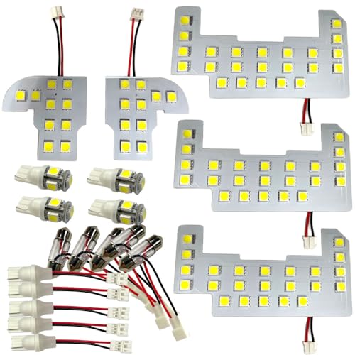 Includes: 2 front map lights (left and right) with 10 SMD bulbs each, 1 center light with 23 SMD bulbs, 1 luggage light with 23 SMD bulbs, 1 rear gate light with 23 SMD bulbs, and 4 T10 bulbs for position and license plate lights with 5 SMD bulbs each.