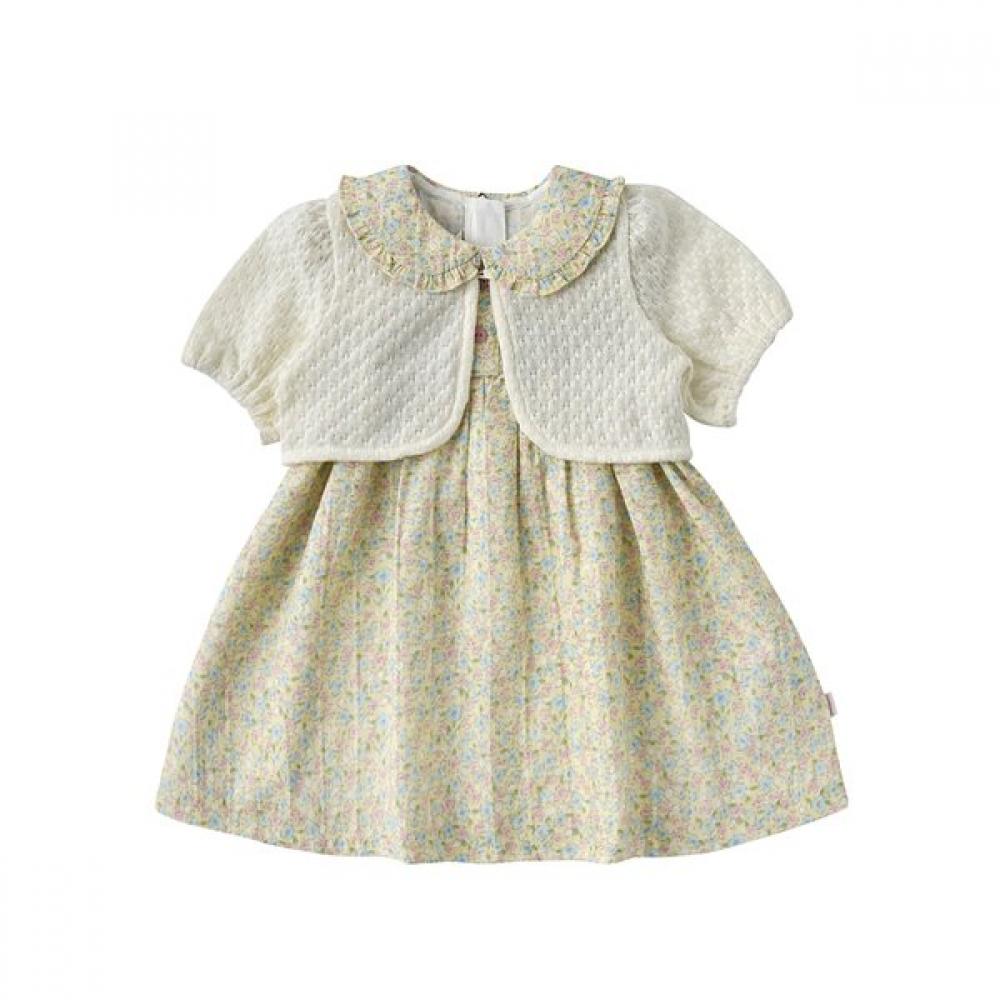 Rosy Garden SET dress in a soft pink color. The soft, lightweight cotton material is accented with a flower print, and the set includes a knit-like cardigan and bloomer to add versatility. It's great to create a twin look by planning a dress and a bodysuit in two forms.