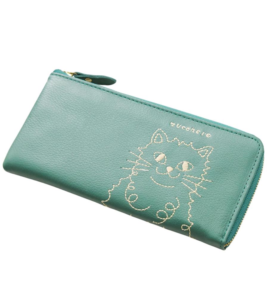 ZUCCHERO Women's Slim Long Wallet, L-Shaped, Genuine Leather, Made In Japan, Slim Cowhide Leather, Cat Design, 55521 (Green)