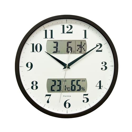 Formia Wall Clock, Radio-Controlled, Quiet, with Temperature and Humidity Monitors, Date, Calendar, Day of the Week, and Nighttime Stop Function, Brow