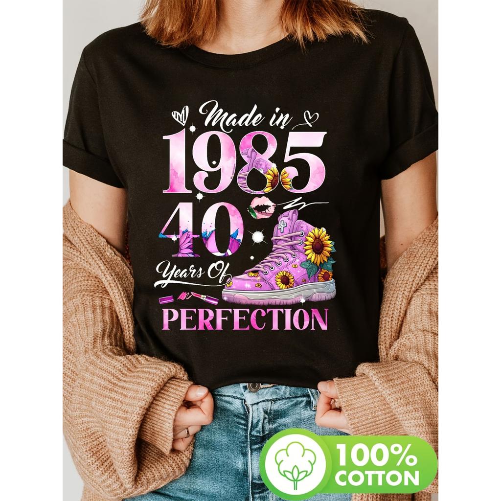 40th Birthday Queen Print T-shirt, Short Sleeve Crew Neck Casual Top for Summer & Spring, Women's Clothing