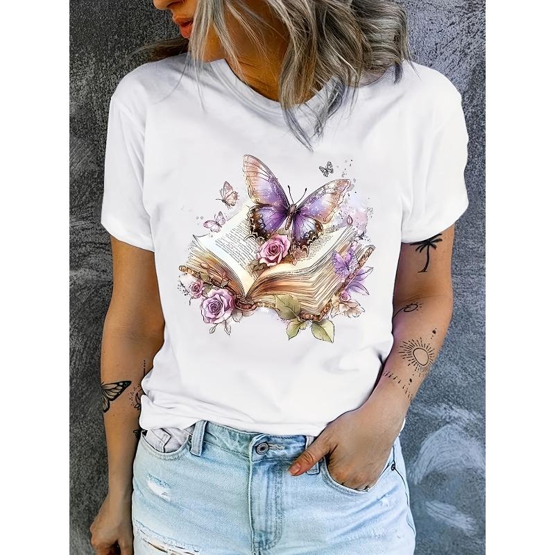 European Size European Size Women's Casual Round Neck Short Sleeve T-Shirt - Butterfly and Book Floral Print, Versatile Top