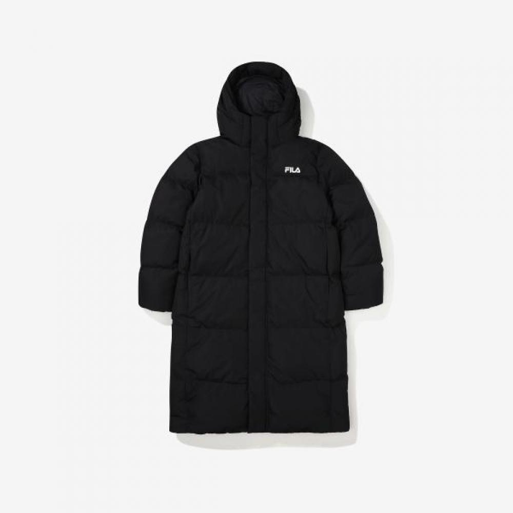 The FILA Hooded Down Long Padding Jacket is a men's padding that provides optimal warmth even in extreme cold. It is made from 100% polyester outer fabric and 100% nylon lining, with 80% duck down and 20% feather filling, ensuring excellent insulation and a lightweight feel. The loose fit allows for good mobility, and it features a hood design. Its black color is suitable for various styling options.