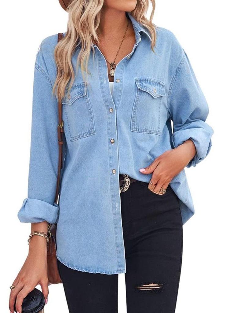 Elevate your casual spring wardrobe with this stylish long-sleeved denim shirt for women. Crafted from soft, breathable cotton, it ensures comfort and durability for everyday wear. The solid pattern and classic turn-down collar add a touch of timeless elegance, making it a versatile choice for various occasions. Perfect for pairing with your favorite jeans or skirts, this shirt seamlessly blends fashion and functionality for a chic, effortless look.