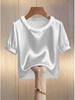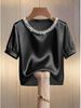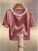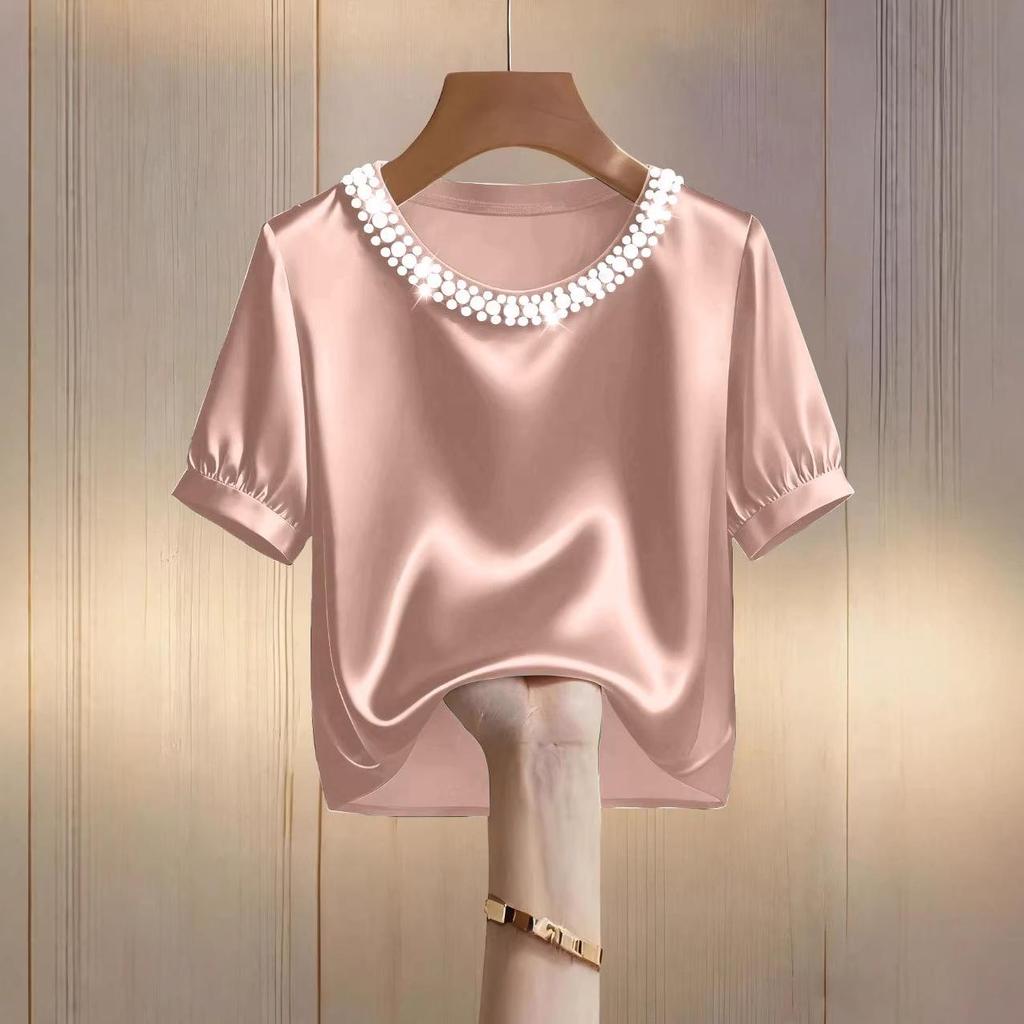 This elegant short-sleeve t-shirt combines timeless style with modern flair, featuring a chic pearl collar and a classic round neckline. Crafted from luxurious satin, it offers a smooth and comfortable fit perfect for summer fashion. The solid pattern allows for easy pairing with various outfits, while the sophisticated design makes it a versatile piece for both casual and dressier occasions.
