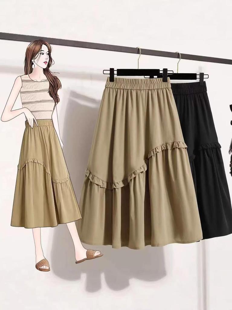 Plus Size Elegant A-line Fluffy Skirt - Spring/Summer Korean Style, Casual High-Waisted, Versatile Mid-Length Skirt