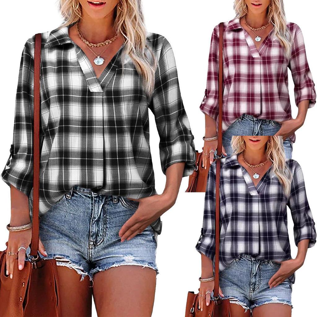2025 Spring/Autumn V-neck Long Sleeve Plaid Pullover Lapel Loose Fit Women's Shirt