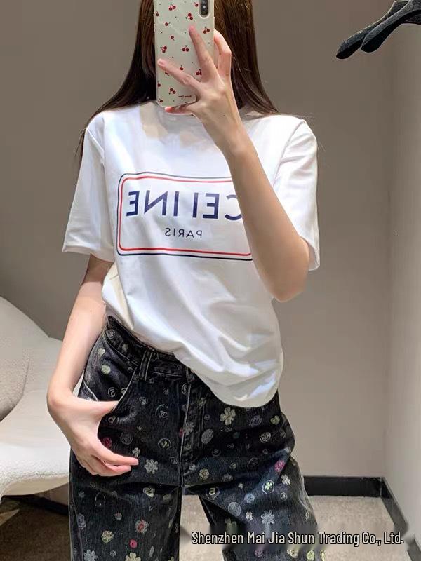 Nanyou Women's High-End Early Spring T-Shirt: CE Letter Print, Simple, Versatile, Short Sleeve, Pure Cotton, Loose Fit, Fashionable.