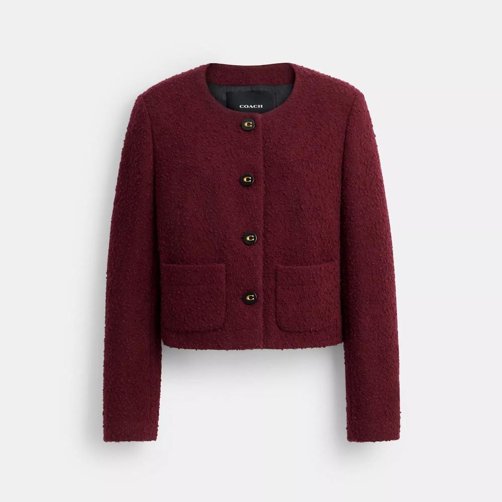 The Coach Boucle Cardigan Jacket in burgundy features a chic design perfect for layering. It is crafted from a blend of 55% wool and 45% polyester for the outer body, while the body lining consists of 58% polyester and 42% viscose. The sleeve lining is made of 96% polyester and 4% elastane. It includes a button closure and slip pockets, with a length of 19 3/4 inches.