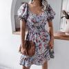 Floral Square Neck Dress with Waist Ruffle Balloon Sleeves Chic Summer