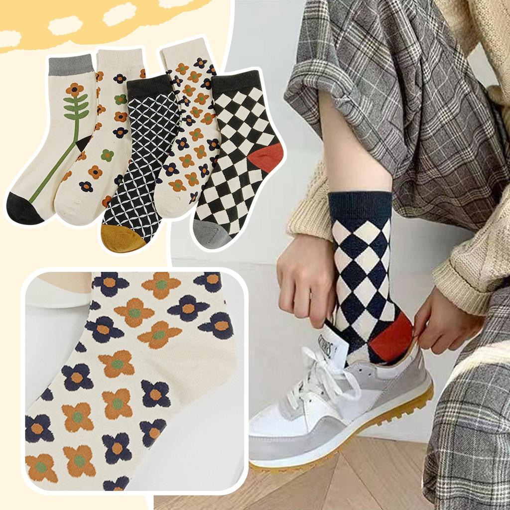 Women's Winter Camellia Checkerboard Pattern Women's Mid Tube Socks Fashionable And Versatile Outer Socks Five Pairs Set