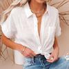 Women Solid Color Short Sleeve Button Up Top with Pocket Shirt Turn Down Collar Blouse Plus Size Summer
